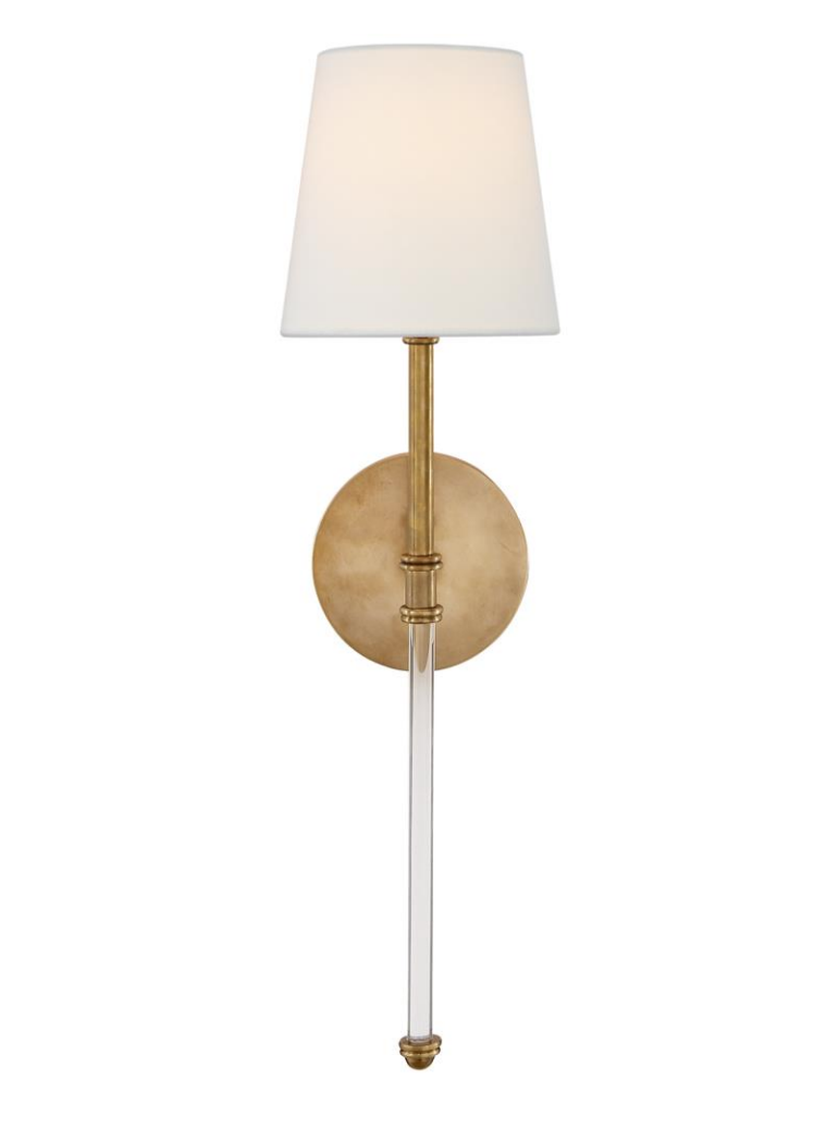 - Kinkiet Camille projektu Suzanne Kasler w kolorze szczotkowanego antycznego mosiądzu z lnianym abażurem. Lampa posiada gniazdo na żarówkę E 14.