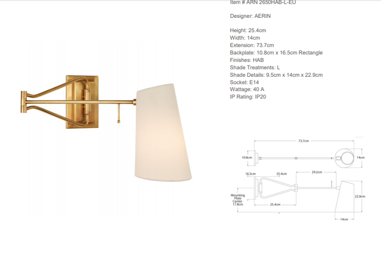 Kinkiet Keil Swing Armn firmy Aerin został wykonany z antycznego mosiądzu oraz wykończony lnianym abażurem. Lampa posiada gniazdo na żarówkę E 14. Wymiary: 25.4 x 14 x 73.7 cm.