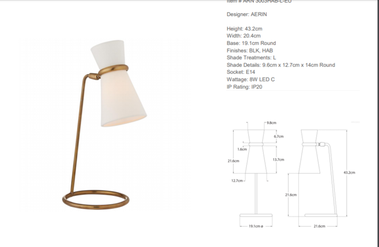 - Lampa Clarkson projektu Aerin została wykonana z mosiądzu oraz wykończona lnianym abażurem. Lampa posiada gniazdo na żarówkę E 14.
