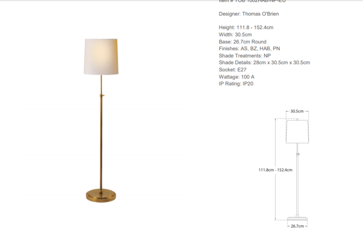 - Lampa podłogowa Bryant projektu Thomas O'Brien marki Visual Comfort ze szczotkowanego antycznego mosiądzu wykończona lnianym abażurem. Lampa posiada gniazdo na żarówkę E 27.