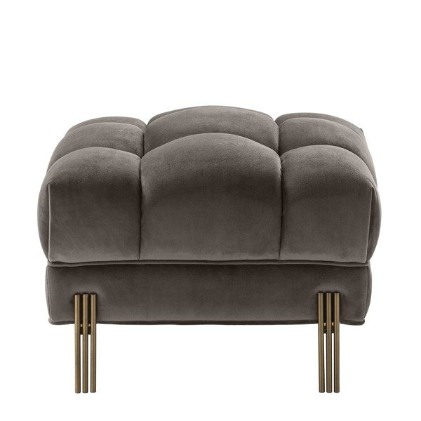 - Puf Sienna firmy Eichholtz został wykonany z aksamitu w szarym kolorze oraz wykończony szczotkowanym mosiądzem.