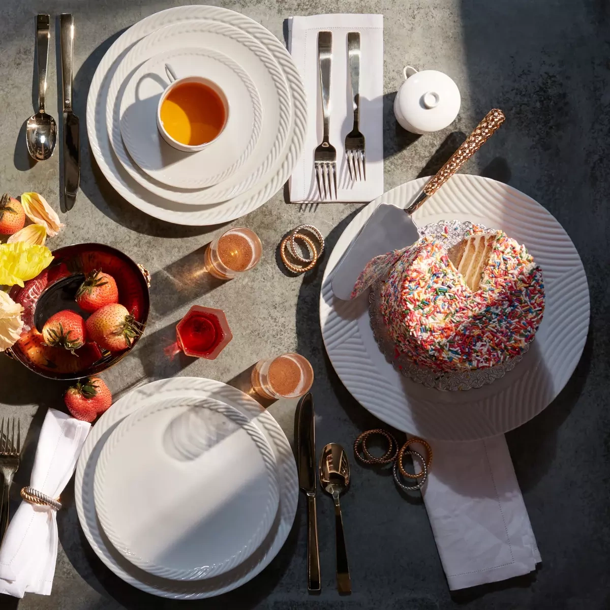 • Talerz deserowy firmy L'Objet, z kolekcji Corde został wykonany z porcelany Limoges oraz wykończony w białym kolorze.