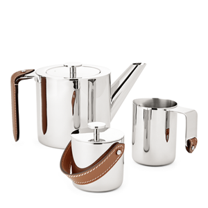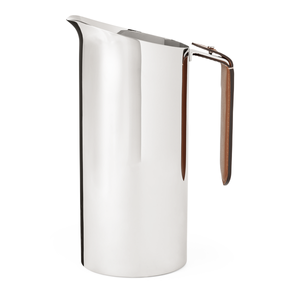 Dzbanek będący częścią kolekcji zastawy stołowej i akcesoriów barowych Wyatt, jest wykonany ze stali nierdzewnej i wykończony rączką owiniętą skórą inspirowaną jeździectwem.