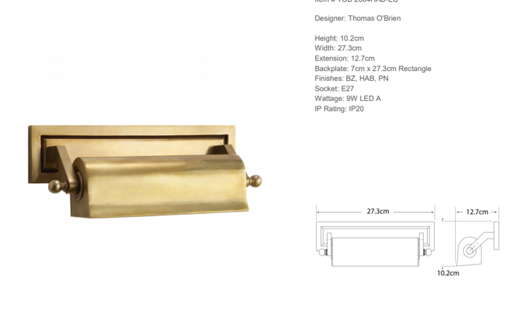 - Kinkiet Library 10 projektu Thomas O'Brien został wykonany z mosiądzu. Lampa posiada gniazdo na żarówkę E 27.