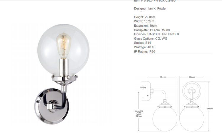 - Kinkiet Bistro projektu Ian K. Fowler został wykonany z niklu polerowanego na wysoki połysk oraz szkłem transparentnym. Lampa posiada gniazdo na żarówke E 14.