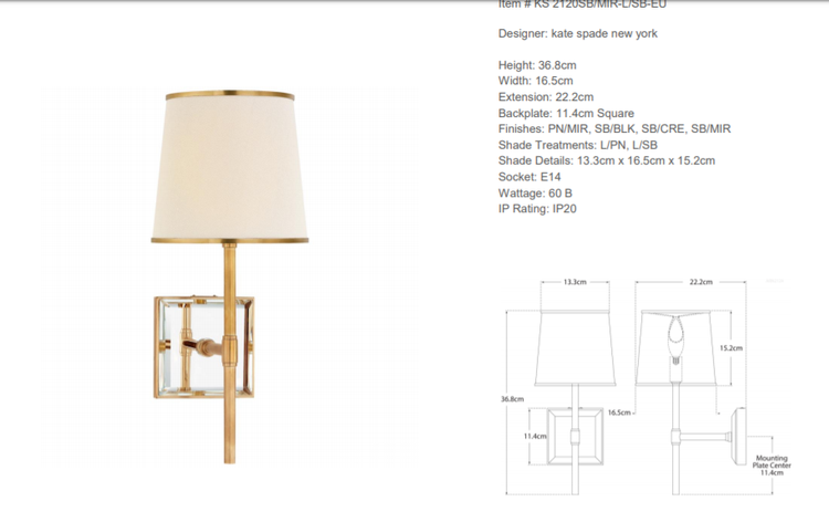 - Kinkiet Bradford projektu Kate Spade New York został wykonany z mosiądzu i szkła oraz wykończony jasnym abażurem. Lampa posiada gniazdo na żarówkę E 14.