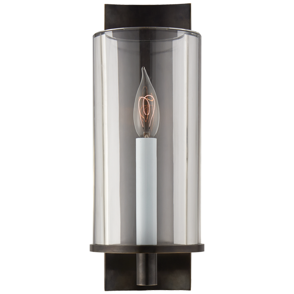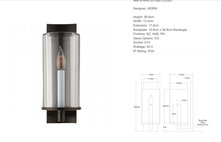 - Kinkiet Deauville firmy Aerin został wykonany z brązu oraz wykończony szkłem transparentnym. Lampa posiada gniazdo na żarówkę E 14.