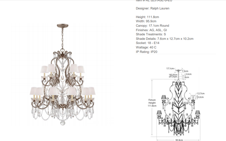 - Żyrandol Adrianna Medium projektu Ralph Lauren Home został wykonany ze srebra. Żyrandol posiada gniazda na żarówki E 14.