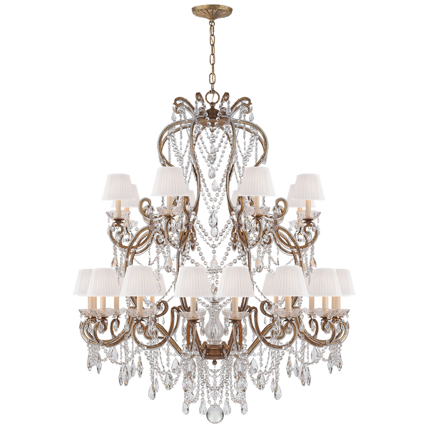 Żyrandol Adrianna Large projektu Ralph Lauren Home został wykonany z pozłacanego żelaza oraz wykończonym jedwabnymi abażurami. Żyrandol posiada gniazda na żarówki E 14. Wymiary: 137,2 x 111,8 x 17,1 cm.