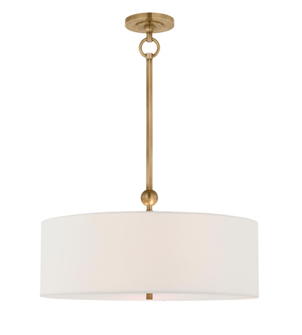Lampa wisząca Reed Thomas O'Brien marki Visyal Comfort ze szczotkowanego antycznego mosiądzu z lnianym abażurem. Lampa posiada gniazdo na żarówkę E 27. Wymiary: wys. 74,9 x szer. 55.9 cm