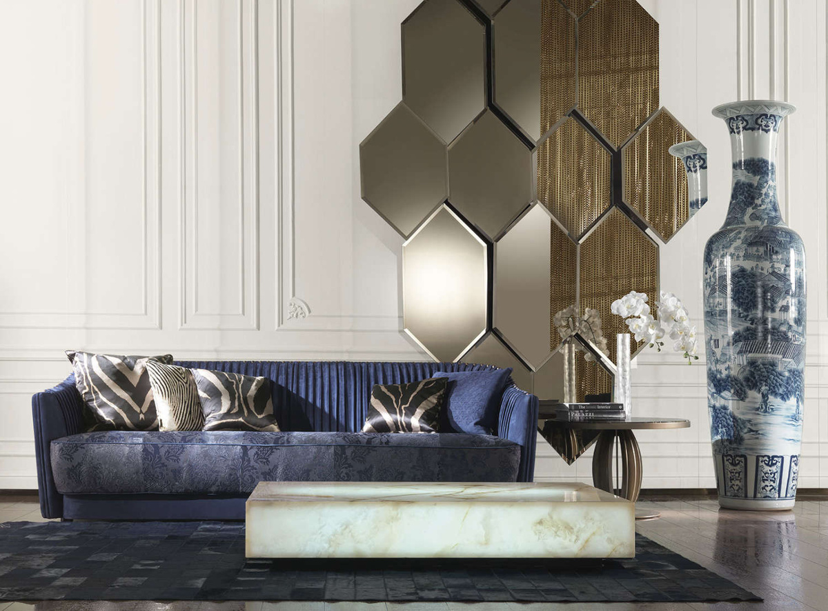 - Stolik kawowy Sahara firmy Roberto Cavalli Home Interiors o konstrukcji z wycinanej laserowo i kalandrowanej blachy w kolorze złotym. Blat z polerowanego marmuru Black Marquinia z częściowo wygrawerowanym monogramem RC.