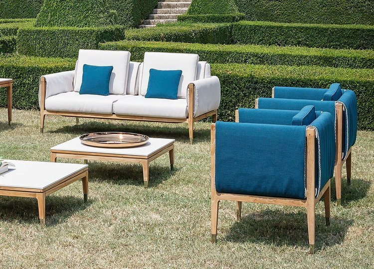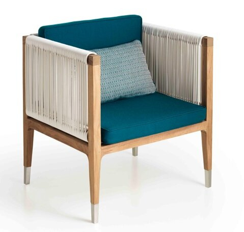 Fotel ogrodowy Ischia firmy Smania został wykonany z drewna tekowego z białymi detalami z politechu. Fotel posiada poduszki ze zdejmowanymi pokrowcami. Fotel wykończony elementami ze stali polerowanej.