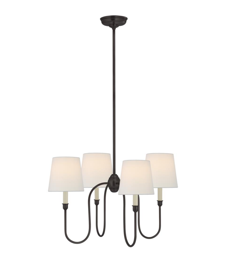 Żyrandol Vendome Small projektu Thomas O'Brien marki Visual Comfort w kolorze brązowym z lnianymi abażurami. Żyrandol posiada gniazdo na żarówkę E 14. Wymiary: 111,8 x 66 x 13,3 cm.