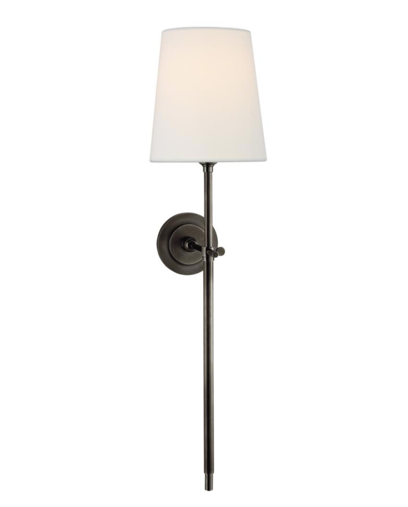 - Kinkiet Bryant Large projektu Thomas O'Brien został wykonany w kolorze brązu oraz wykończony lnianym abażurem. Lampa posiada gniazdo na żarówkę E 27
