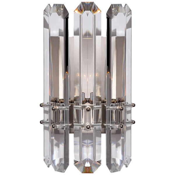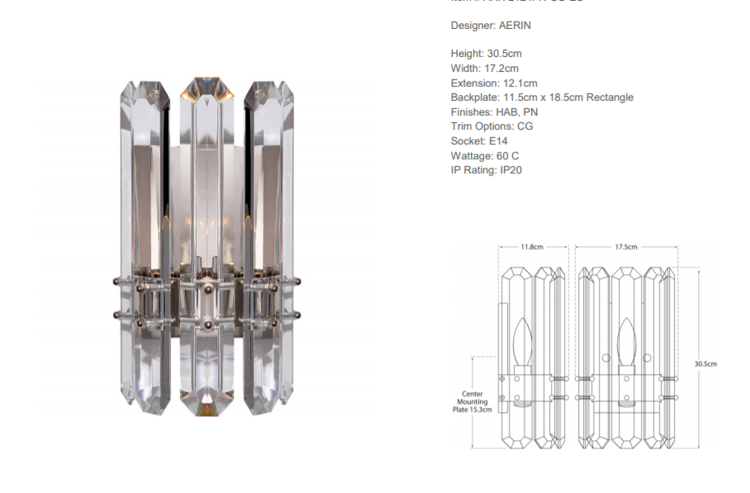 - Kinkiet Bonnington projektu Aerin został wykonany z polerowanego niklu na wysoki połysk oraz wykończony kryształem. Lampa posiada gniazdo na żarówkę E 14.