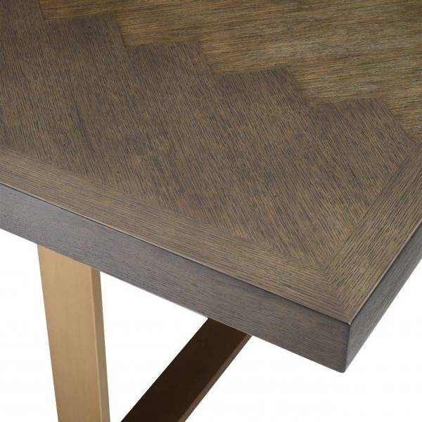 • Stół Melchior firmy Eichholtz został wykonany z forniru dębowego w brązowym kolorze oraz wykończony szczotkowanym mosiądzem.