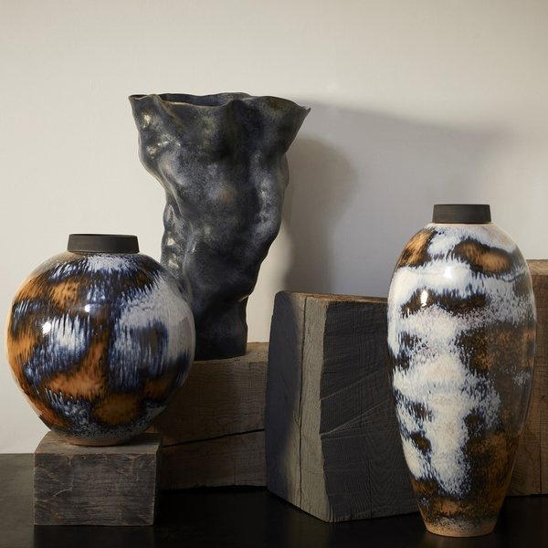 Wazon firmy L'Objet, z kolekcji Terra to dekoracyjny obiekt o rzeźbiarskim charakterze, inspirowany naturalnymi krajobrazami i strukturami ziemi. Smukła forma została pokryta efektownym szkliwem, w którym przenikają się odcienie błękitu, brązu i ciepłych tonów ziemi, tworząc niepowtarzalny wzór. Artystyczne wykończenie sprawia, że każdy egzemplarz ma unikalny charakter i doskonale sprawdzi się jako centralny akcent eleganckiej aranżacji. Wymiary: 28 x 64 cm.