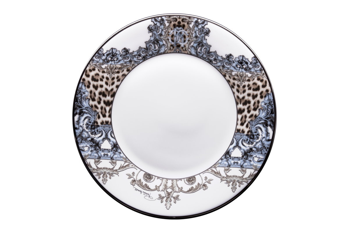 - Talerz deserowy firmy Roberto Cavalli Home, z kolekcji Palazzo Pitti został wykonany z wysokiej jakości porcelany z delikatnym obrzeżem w kolorze platyny oraz nadrukiem lamparta.