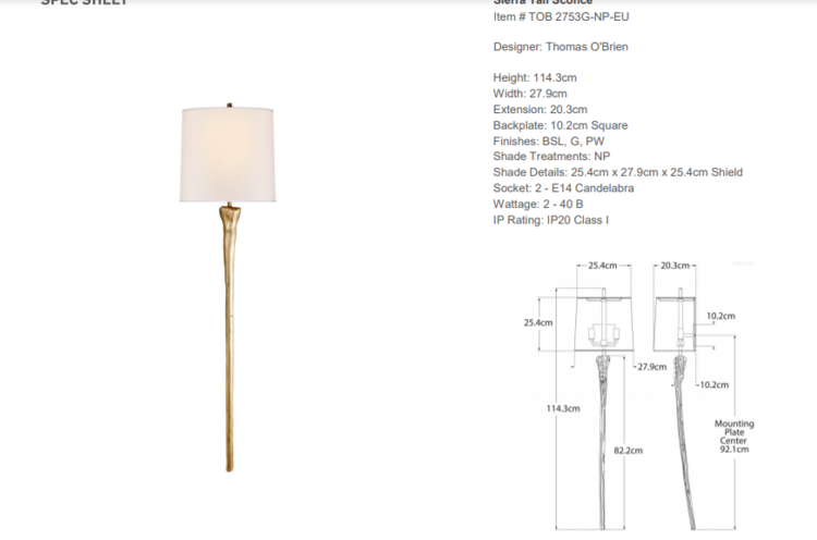 - Kinkiet Sierra Tail projektu Thomas O'Brien został wykonany w złotym kolorze z jasnym, papierowym abażurem. Lampa posiada gniazdo na żarówkę E14.