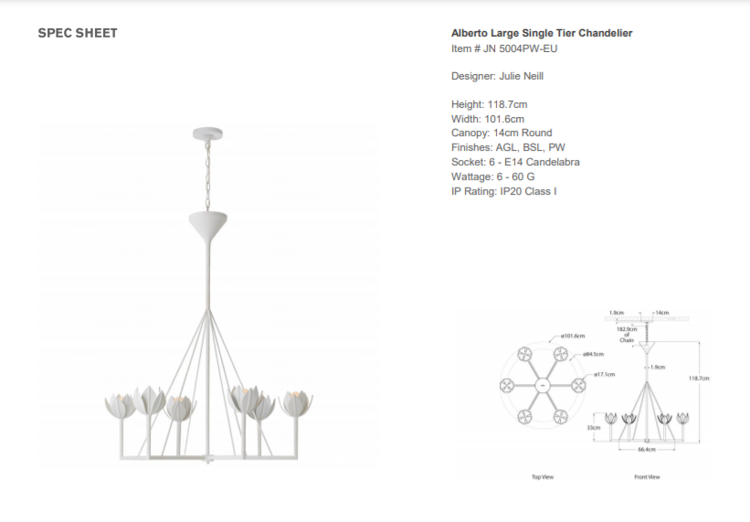 - Żyrandol Alberto projektu Julie Neill został wykonany z tynku w białym kolorze. Lampa posiada gniazdo na żarówkę E 14.