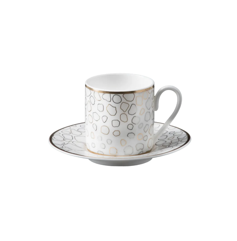 - Zestaw filiżanek do kawy firmy Roberto Cavalli Home, z kolekcji Giraffa został wykonany z wysokiej jakości porcelany kostnej. Odznacza się zewnętrzną powłoką, pokrytą złotem i platyną, przypominającą skórę żyrafy oraz monogramem Roberto Cavalli.