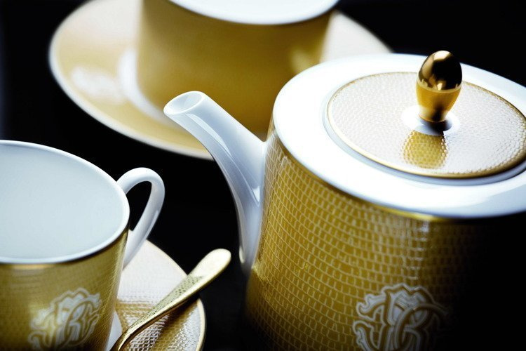 - Filiżanki do herbaty zostały wykonane z wysokiej jakości porcelany Bone China, odznaczają się bogatą zewnętrzną powłoką, pokrytą 24 karatowym złotem, przypominającą skórę jaszczurki oraz monogramem wytłoczonym na zewnątrz.