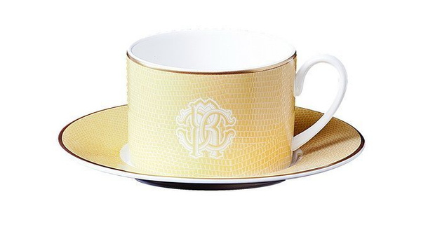 Filiżanki do herbaty zostały wykonane z wysokiej jakości porcelany Bone China, odznaczają się bogatą zewnętrzną powłoką, pokrytą 24 karatowym złotem, przypominającą skórę jaszczurki oraz monogramem wytłoczonym na zewnątrz. Pojemność: 0,2 L.