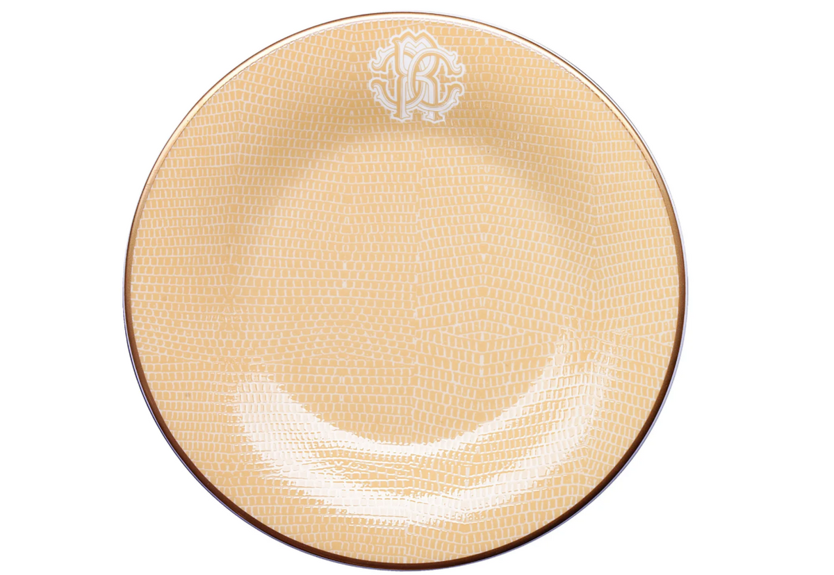 - Zestaw talerzy deserowych został wykonany z wysokiej jakości porcelany Bone China. Odznacza się wewnętrzną powłoką, pokrytą 24 karatowym złotem, przypominającą skórę jaszczurki oraz monogramem wytłoczonym wewnątrz Roberto Cavalli.