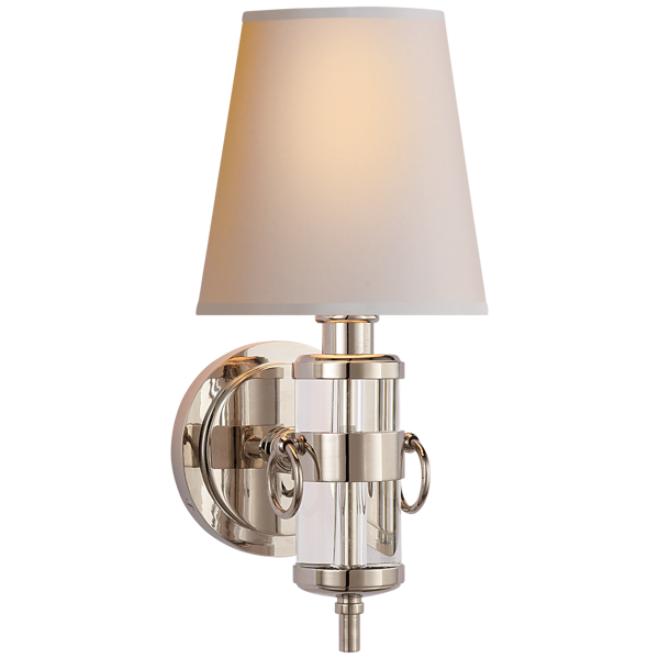 - Kinkiet Jonathan projektu Thomas O'Brien został wykonany z kryształu oraz wykończony jasnym, papierowym abażurem. Lampa posiada gniazdo na żarówkę E27