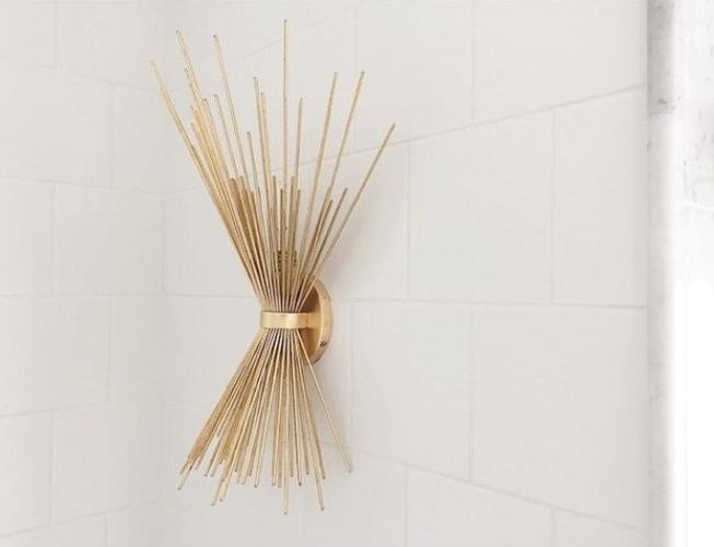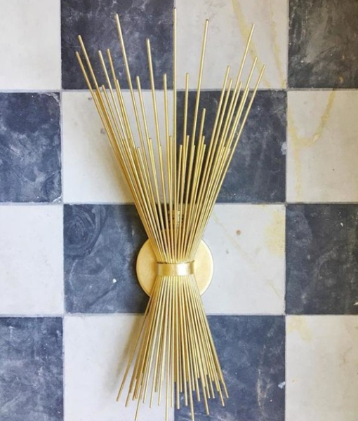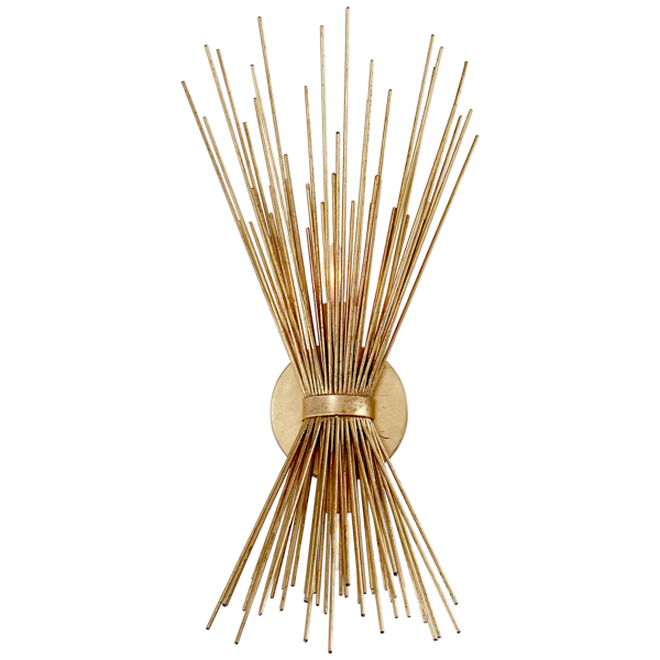 Kinkiet Strada Small projektu Kelly Wearstler w kolorze postarzanego złota, rzuca prążkowaną poświatę na ścianę. Lampa posiada gniazdo na żarówkę E 14. Wymiary: 49,9 x 20.4 cm