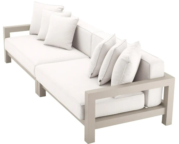 Sofa ogrodowa Cap-Antibes firmy Eichholtz została wykonana ramą w kolorze piaskowym z aluminium oraz wykończona tkaniną sunbrella canvas. Tkanina używana w naszej kolekcji outdoor jest najpopularniejszym materiałem outdoorowym Sunbrella®. Tkany w 100% z barwionego w masie akrylu, Sunbrella® jest łatwa w pielęgnacji, odporna na plamy, trwała kolorystycznie i zapewnia do 98% ochrony przed promieniowaniem UV.