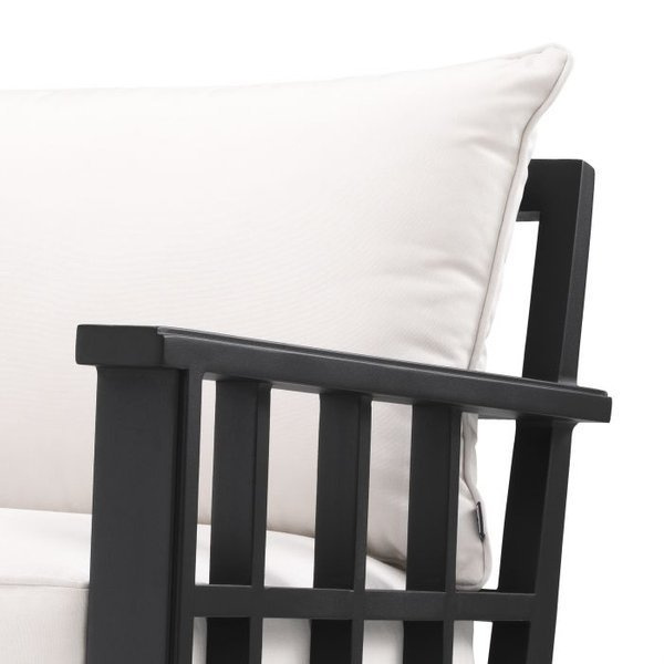 Fotel ogrodowy Cap-Ferrat firmy Eichholtz został wykonany ramą w kolorze czarnym z aluminium oraz wykończony tkaniną sunbrella canvas. Tkanina używana w naszej kolekcji outdoor jest najpopularniejszym materiałem outdoorowym Sunbrella®. Tkany w 100% z barwionego w masie akrylu, Sunbrella® jest łatwa w pielęgnacji, odporna na plamy, trwała kolorystycznie i zapewnia do 98% ochrony przed promieniowaniem UV.