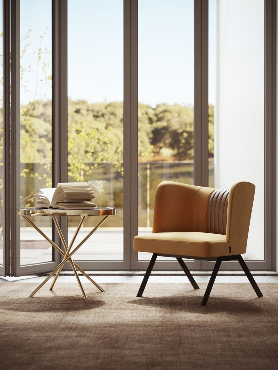• Fotel Gordon firmy Laskasas został wykonany z wiedeńskiej tkaniny oraz wykończony nóżkami ze stali nierdzewnej.