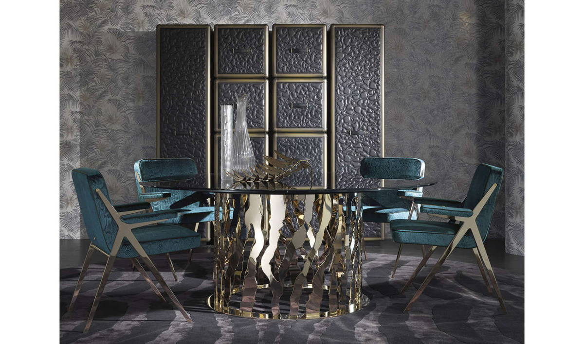 - Stół B-52 firmy Roberto Cavalli Home Interiors został wykonany z metalu oraz wykończony blatem z dębu w kolorze wenge lub marmurem.