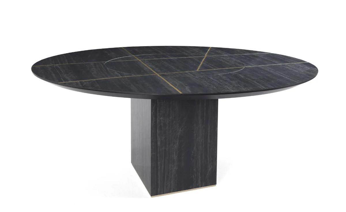 - Stół Comore firmy Roberto Cavalli Home Interiors został wykonany w kolorze czarnym z porcelanowego gresu oraz wykończony blatem z wielowarstwowego drewna.