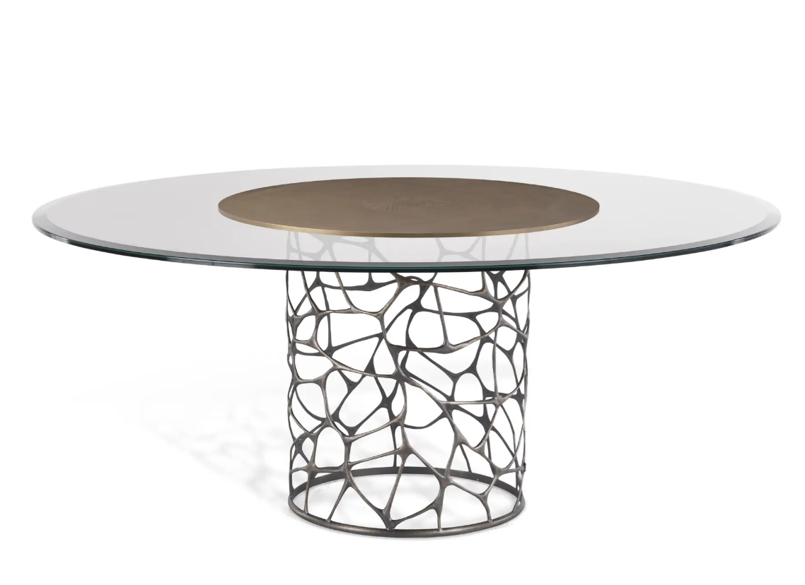 Stół Sioraf firmy Roberto Cavalli Home Interiors został wykonany z mosiądzu o wzorze żyrafy oraz wykończony blatem ze szkła. Produkt dostępny w różnych wykończeniach materiału. Podana cena jest ceną podglądową, zmieniająca się w zależności od rodzaju wykończenia. Wymiary: ø 160 x h 75 cm.
