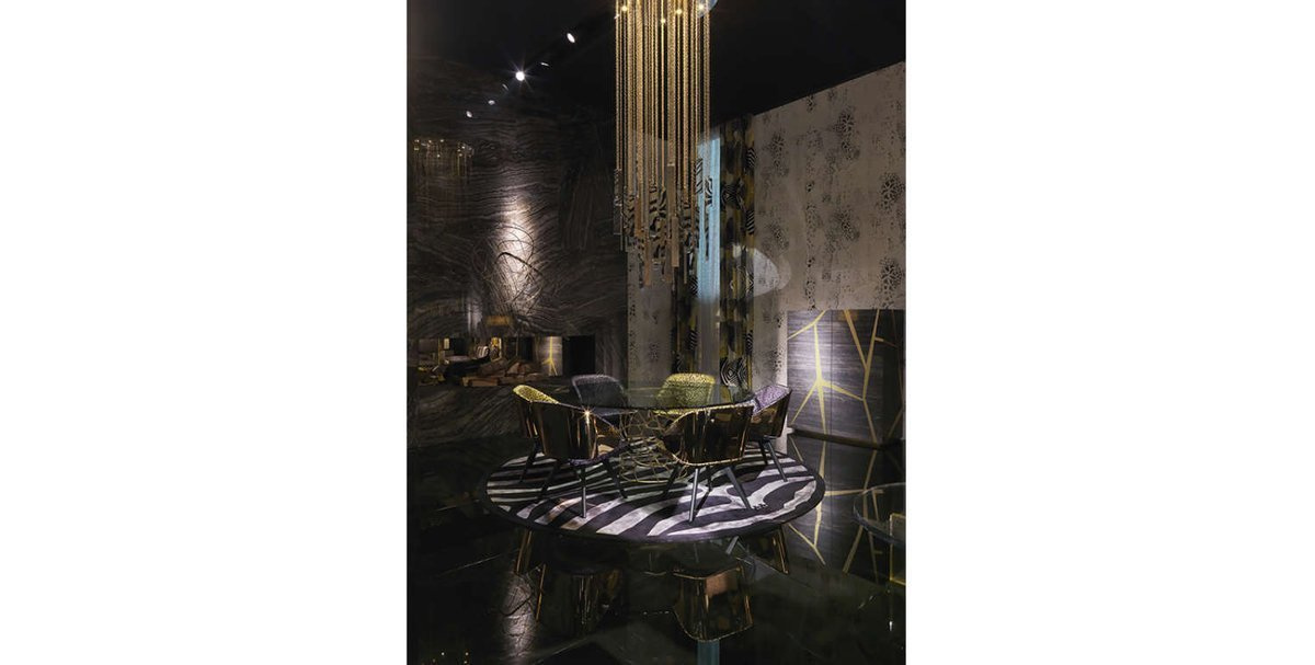 • Stół Sioraf firmy Roberto Cavalli Home Interiors został wykonany z mosiądzu o wzorze żyrafy oraz wykończony blatem ze szkła.