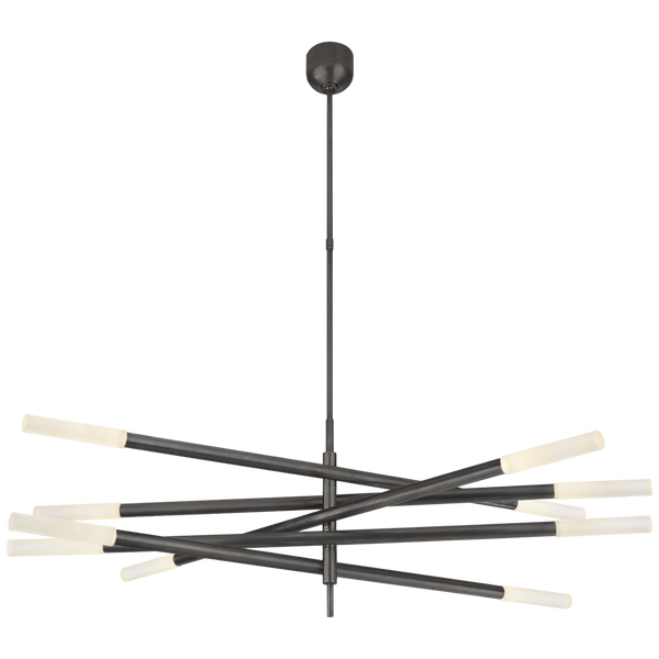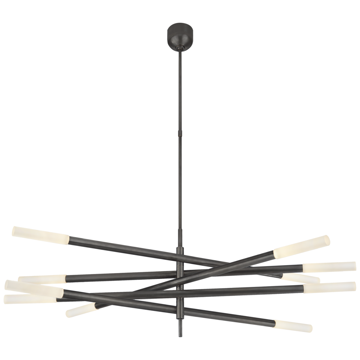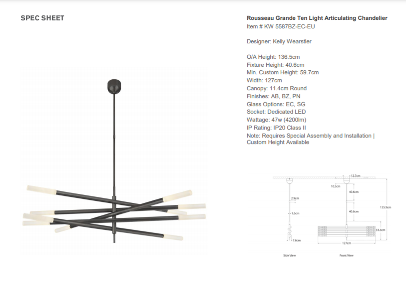 Żyrandol Rousseau Grande Ten projektu Kelly Wearstler został wykonany z brązu oraz wykończony kryształem. Lampa posiada diodę LED.