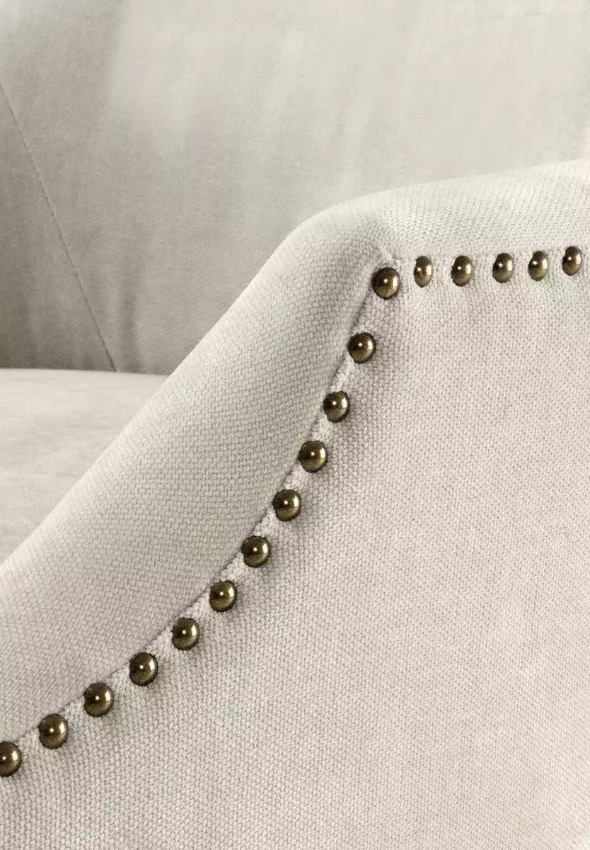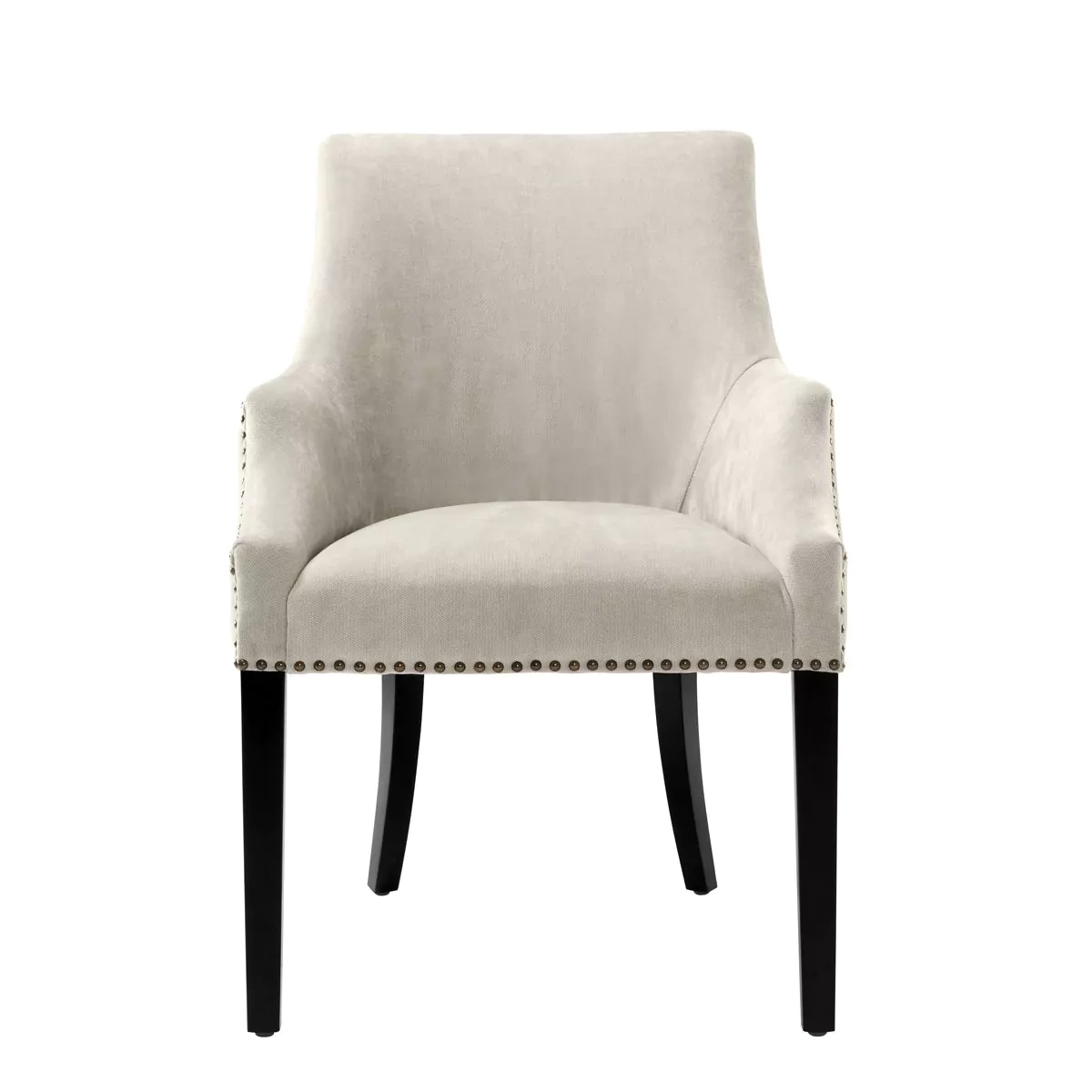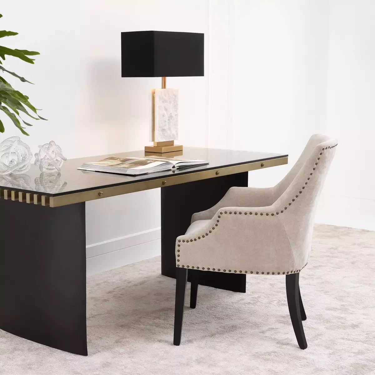- Krzesło Legacy firmy Eichholtz zostało wykonane tkaniną clarck sand.oraz wykończone czarnymi nogami i złotymi detalami.