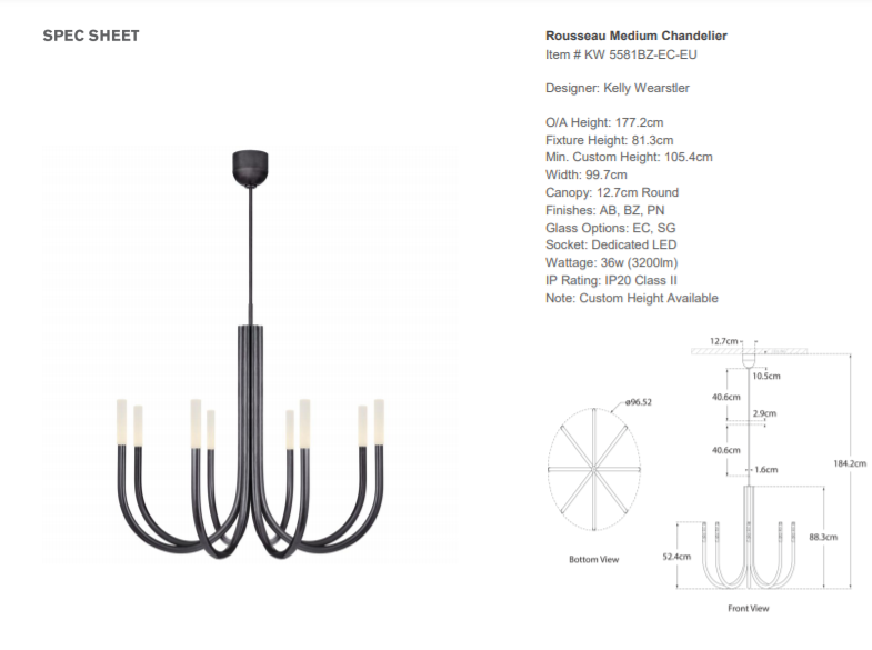 Żyrandol Rousseau Medium projektu Kelly Wearstler został wykonany z brązu oraz wykończony kryształem. Lampa posiada diodę LED.