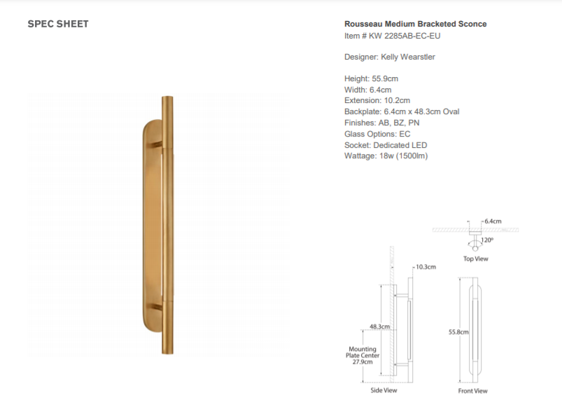 Kinkiet Rousseau Medium projektu Kelly Wearstler został wykonany z mosiądzu oraz wykończony kryształem. Lampa posiada diodę LED.