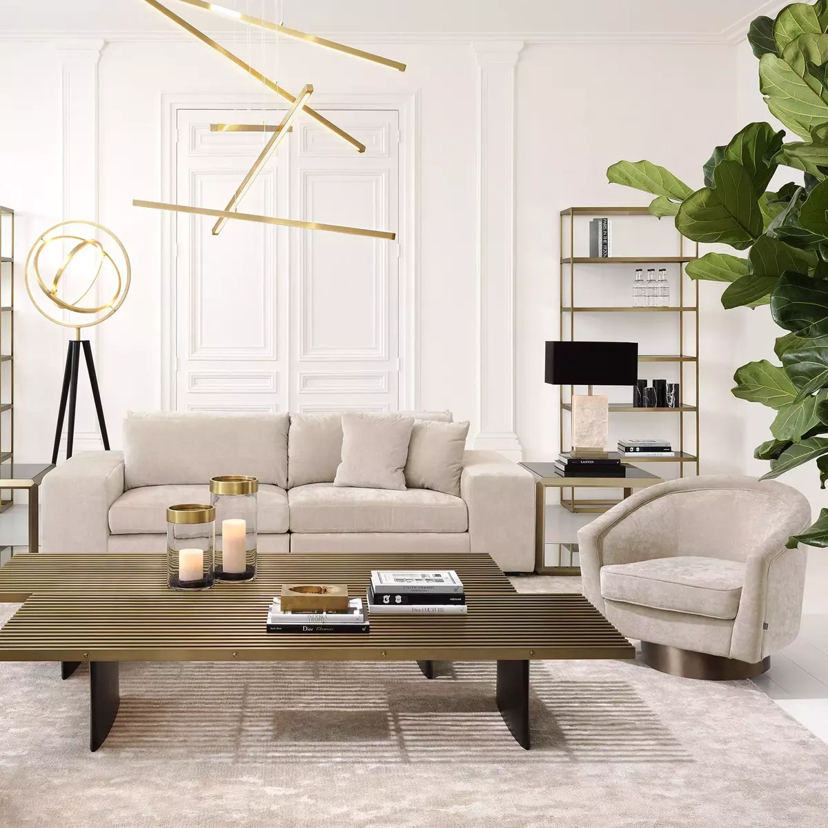 - Fotel Catene firmy Eichholtz został wykonany w kolorze clarck sand oraz wykończony obrotową podstawą z matowego złota.