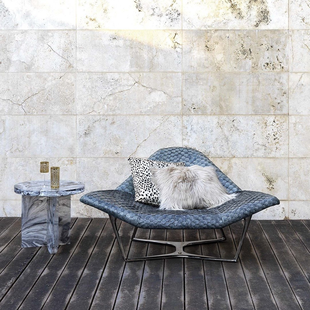 Fotel Wings firmy Roberto Cavalli Home Interiors. Struktura z wielowarstwowego drewna i pianki. Tapicerka z tkaniny lub skóry z kolekcji. Metalowa podstawa dostępna we wszystkich szczotkowanych wykończeniach. Podana cena jest ceną w tkaninie z kategorii A. Fotel dostępny w różnych tkaninach oraz skórach. Wymiary: 145 x 105 x 75 cm.