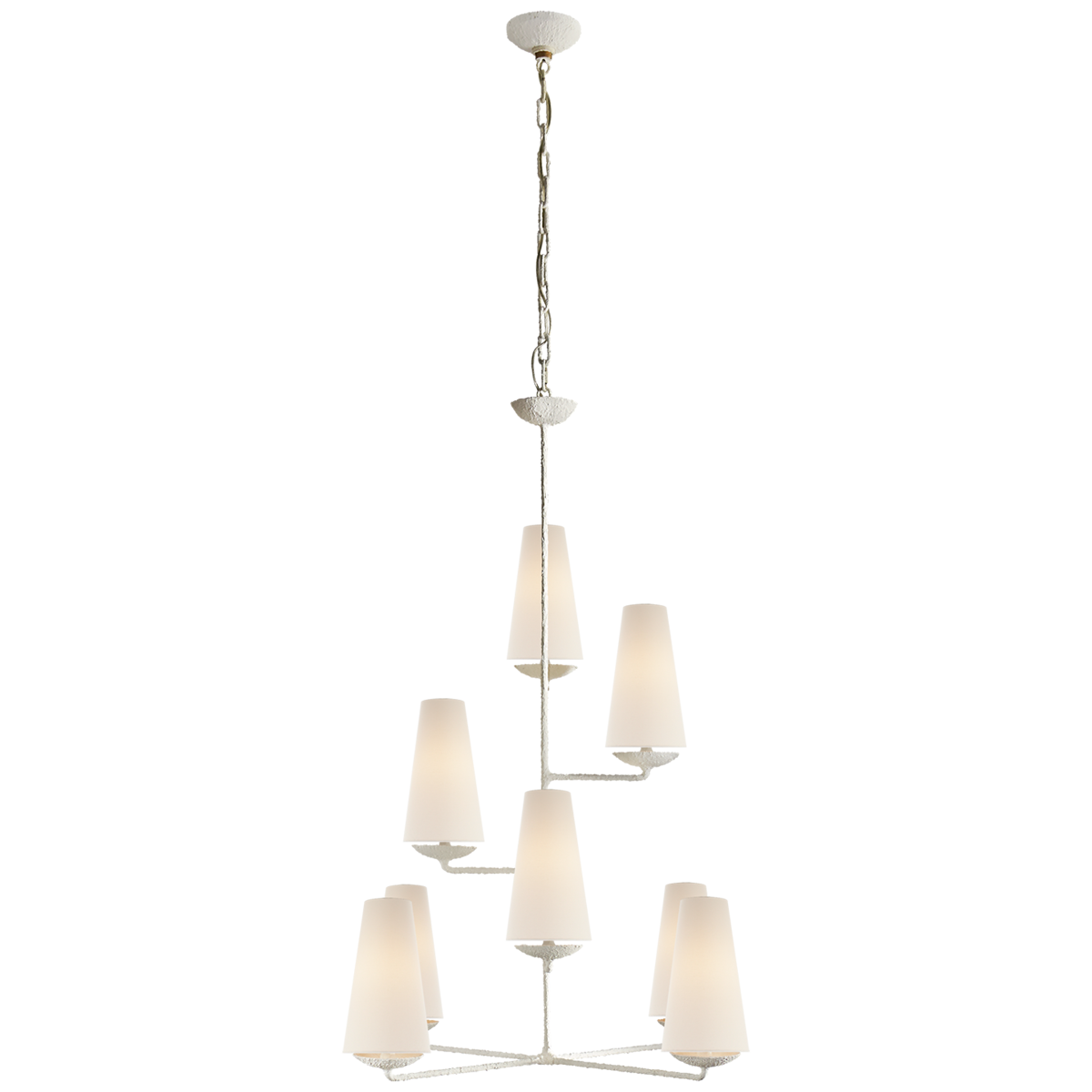 Żyrandol Fontaine projektu Aerin został wykonany z gipsu w białym kolorze oraz wykończony lnianymi abażurami. Lampa posiada gniazdo na żarówkę E 14. Wymiary: 87 x 114,9 cm.