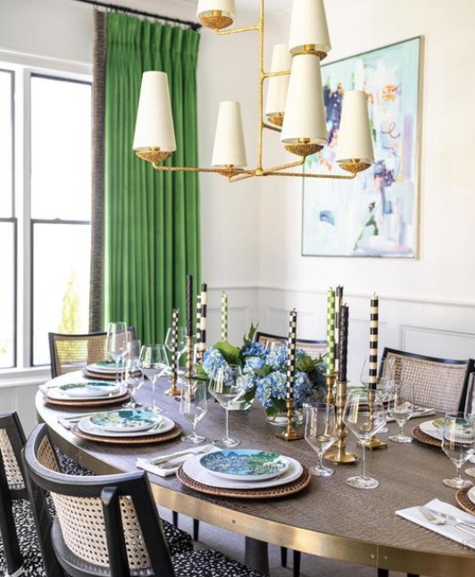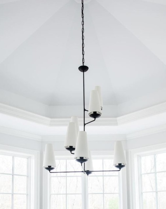- Żyrandol Fontaine projektu Aerin został wykonany z postarzanego żelaza oraz wykończony lnianymi abażurami. Lampa posiada gniazdo na żarówkę E 14.