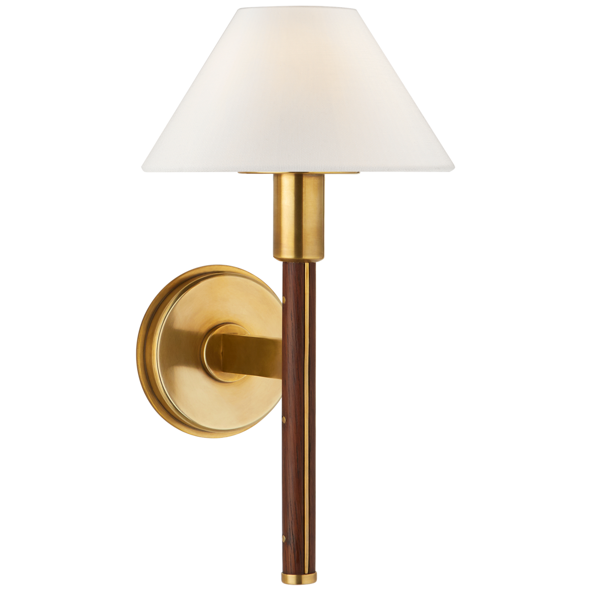 Kinkiet Radford Small projektu Ralph Lauren Home został wykonany z mosiądzu i naturalnego dębu oraz wykończony jasnym, lnianym abażurem. Lampa posiada gniazdo na żarówkę E14. Wymiary: 34,9 x 19,7 x 21 cm.